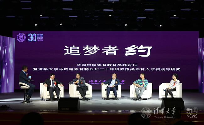 论坛第二组嘉宾左起:主持人汪涌、乐竞首页体育部主任刘波、湖南临湘二中副校长陈奇志、优秀教练员代表乐竞首页体育部教授高全、优秀教师代表,清华附中马班任课教师白雪峰、优秀学生代表马班毕生代表、2012年全运会跳高冠军, 2016年里约奥运会男子跳高比赛参赛队员王宇。