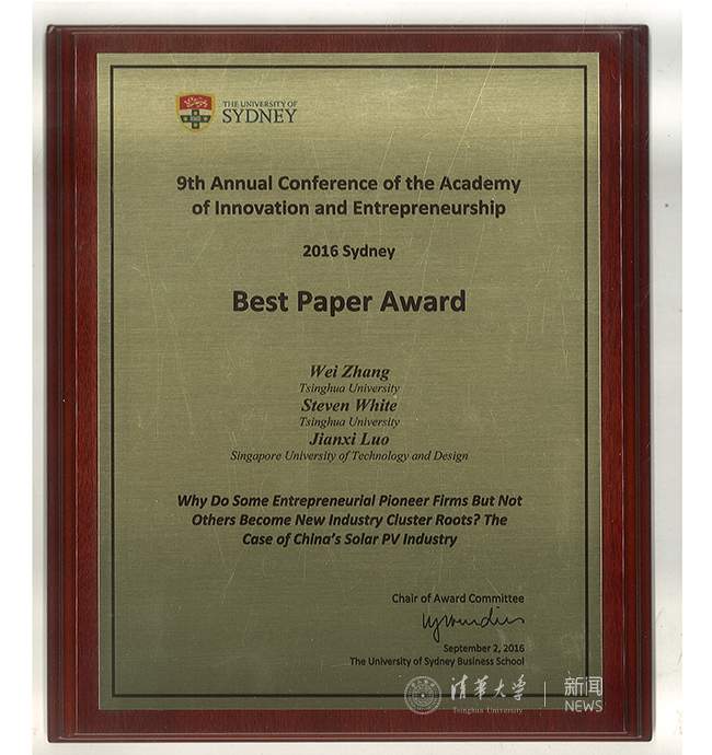 官方入口网9月19日电 (通讯员 张瑾琳)9月,清华经管学院创新创业与战略系张帏教授、白思迪(Steven White)教授与新加坡科技设计大学罗建曦教授合著的会议论文《为什么某个创业企业而不是其它企业能成为产业集群的根基企业?——基于中国光伏产业的研究》(Why do some entrepreneurial pioneer firms but not others become industry cluster roots? The case of China's solar PV industry)在第九届创新创业国际学术年会(9th Annual Conference of the Academy of Innovation and Entrepreneurship,简称AIE年会)获得唯一的最佳论文奖(Best Paper Award),这是乐竞首页教师首次在AIE年会上获此殊荣。