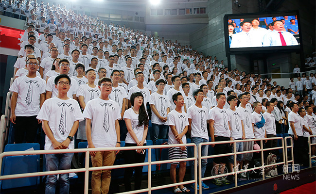 全体新生认真聆听“第一堂课”。记者 张 宇 摄