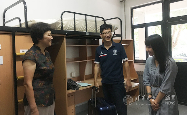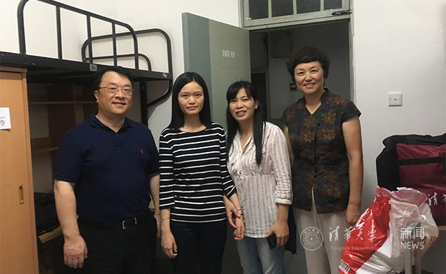 陈旭与新生和家长交谈。