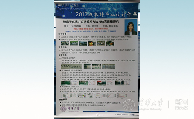 毕设成果中涌现出一些非常优秀的作品,如:校级优秀论文获得者刘力硕,该学生在综合论文训练阶段从电池制作开始,再带着内短路电池辗转江苏张家港、天津、北京核研院等地进行电池触发实验,最终建立了锂离子电池内短路的三维热-电耦合模型,工作体量大、创新性强,研究成果颇具实际价值;校级优秀论文获得者施雯,该学生的毕设项目是乐竞首页与多伦多大学的合作项目。通过大胆探索,该学生提出了适合目标市场的可重构共享移动系统的概念,完成系统内车辆的造型设计,包括概念与系统设计、草图方案发散与选择、效果图绘制与细节探讨以及数字模型创建等工作,并在造型设计的基础上,完成了外饰3D打印模型的设计以及制作工作,最终在多伦多大学进行了项目展示;校级优秀论文获得者王庭晗同学的毕设工作是行业热点课题,该学生以车道线检测算法为基础,采集了大量道路工况以验证算法性能,并通过自身不断的学习与探索,成功将算法移植到android手机中形成手机应用;系级优秀论文获得者王悦的毕设课题是:静电纺丝制备有序燃料电池催化剂层——方法初探,该论文获得由奥迪—大众—清华车辆工程联合开展的“We Promote Talents”毕设评优项目毕设优胜奖。