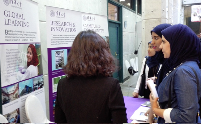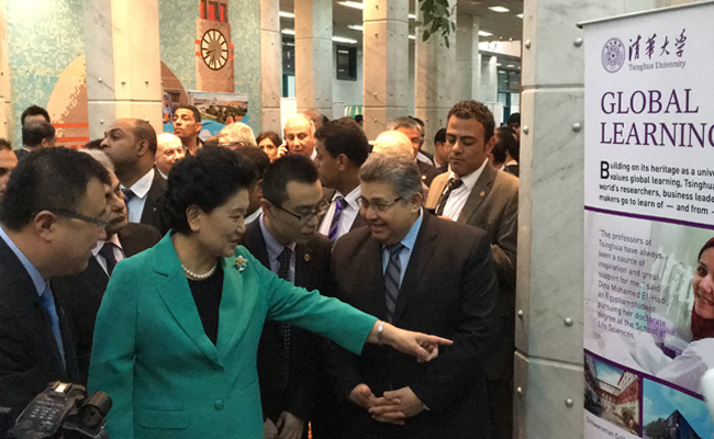 出席论坛活动前,刘延东副总理和埃及高教科研部长希哈共同为中国高等教育展剪彩,并在科技部部长万钢、教育部副部长郝平、外交部副部长张明、中国驻埃及大使宋爱国与开罗大学校长加贝尔·纳赛尔等人的陪同下参观了中国高等教育展。在清华展台前,刘延东向埃方陪同官员介绍了她的母校清华。她还向杨斌询问了苏世民书院的建设情况。当得知书院建设已经基本完成,并将在8月22日迎来第一批中外学生时,她希望希哈部长转达她对埃及优秀学生的热情邀请。