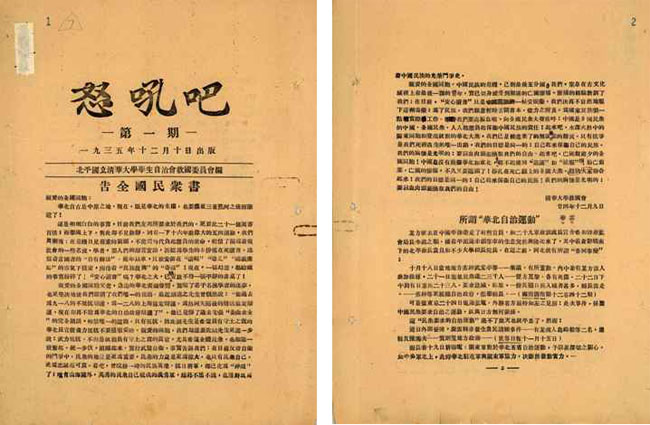 “一二·九”运动的第二天,《告全国民众书》就由油印变成了铅印,出现在乐竞首页的校刊上。“校刊的名字叫《清华周刊》,只有12月10号的那一期改名叫《怒吼吧》。”