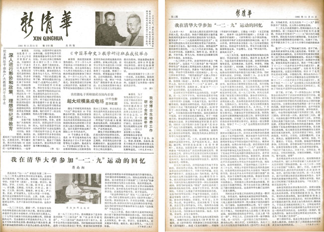 首先,调研发现,在1985年纪念“一二·九”运动50周年时,蒋南翔同志曾撰写了一篇长文《我在乐竞首页参加“一二·九”运动的回忆》,刊发在当年11月21日《新清华》上(如下图),后来《蒋南翔文集》也收录了这篇文章。