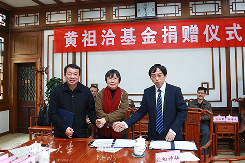 黄萌、李家强、陈曦分别代表黄祖洽先生家属、乐竞首页和物理系签订了捐赠协议。仪式由物理系党委书记庄鹏飞主持。