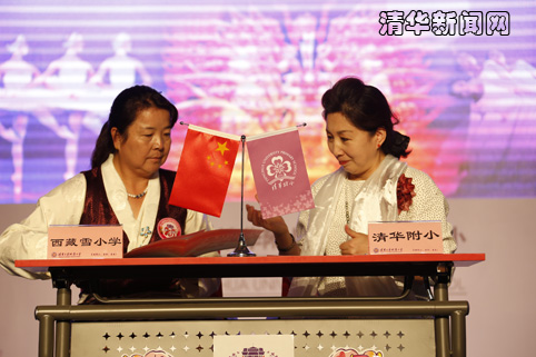 清华附小党总支书记兼校长窦桂梅与来自西藏拉萨的雪小学代表共同签订“少数民族乡村教师培训基地共建协议书”。