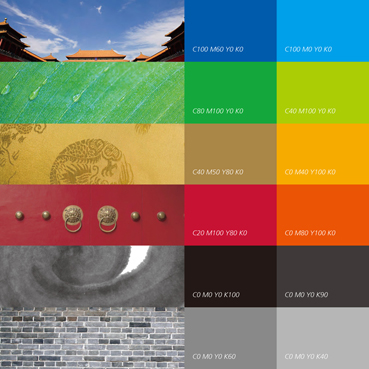中国馆标识(L0GO)用线与面勾勒出大自然的轮廓和曲线,蓝色代表天空,绿色代表田野,金色代表粮食,红色代表人和生命。起伏的线段富有韵律,形似中国馆主体建筑的轮廓。透叠的图形寓意世间万物和谐共生、天人合一的传统思想。中国馆标识、色彩系统及水墨绘画辅助图案,经过拆分重组,提供了一个可延伸的设计结构。标识体现了“天、地、人、和”的整体设计的理念,其设计语言也与米兰世博会的主标识相呼应,象征东西方文明的交融。