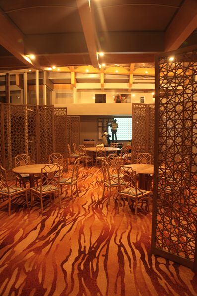 结合主题,在选材方面坚持可持续发展的环保理念,打造亲近自然的室内空间。主要四个空间为:一层开放用餐区、二层宴会厅、影音厅及贵宾室。一层开放用餐区的墙面选用了简单自然的OBS欧松板饰面,顶面为金属冲孔板,地面使用了抛光混凝土加树脂漆的淳朴材料,结合一望无际的“麦田”景观,凸显贴近自然的原生态设计理念。二层以“盛夏”为主题的宴会厅色彩热情浓郁,活动屏风的编制取自于民间的竹编图形,有贵宾入席时可将屏风围合展开,让每位宾客都能有中国用餐礼仪中讲究的“靠墙之位”,八方皆为上座,弘扬中华餐饮礼仪。影音厅以体现中国古代劳动人民智慧与勤劳的“梯田”为主题,在坡地上分段沿等高线建造的阶梯式“农田”与影音厅地面的座位有机的结合在了一起,取用我国特有的24节气中“春分.谷雨”为主题的地毯将地面装点得翠绿清爽,与叠起的“梯田”座椅相结合,让观众仿佛置身自然之中。巨大的无缝拼接led飞屏给观众带来最震撼的视觉享受。贵宾室的设计将土地与树的元素融入其中,配有“金秋”主题的地毯与“生生不息”主题的挂毯。在配饰方面融入了24节气元素进行色彩及意向图样的艺术创作,使中国独有的节气文化与室内展陈进行了艺术化的融合。