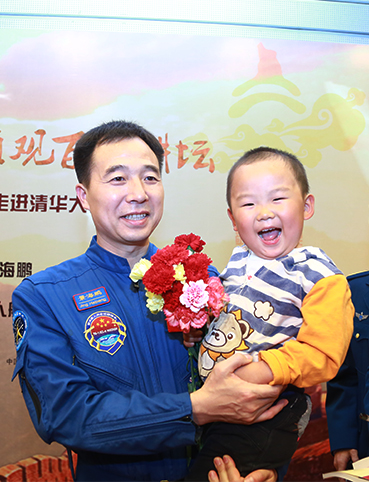 景海鹏与最小的“航天迷”合影。记者 苑 洁 摄