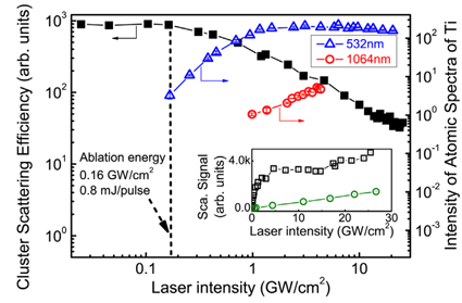 图为纳米TiO2颗粒在不同激光强度下散射效率和PS-LIBS信号的变化。