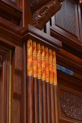 由于时间紧,集贤厅的设计不同于常规项目,施工图完成之后,实际工作量仅完成了三分之一,其余大量后续深化的设计工作,是在与十七家传统工艺和艺术生产厂家或工艺作坊的共同努力和反复磋商推敲中完成的。现场搭建木柱大梁,除了按一比一实样,甚至还十几二十遍地制作各个局部。一比一的大样,各个配件,一卡车一卡车运到工作室,设计师团队与工匠艺人、技术人员和工人师傅共同分析、修改,大家齐心协力、不厌其烦才成就每一道工艺、制作、细节和效果。