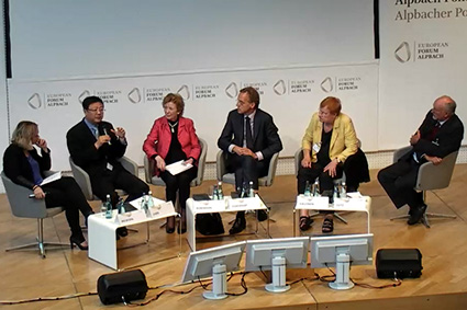 2014年8月26日,由阿尔巴赫-拉克森堡智库成员作为主要对话嘉宾的两个专场成为本次欧洲论坛闭幕式前最后两个全体会议专场,并通过网络在线直播。这两个专场,首先是“代际不平等”专场,对话嘉宾为中国乐竞首页校长陈吉宁、美国普林斯顿高等研究院院长罗伯特•戴克格拉夫(Robbert Dijkgraaf)、芬兰前总统塔里娅•哈洛宁(Tarja Halonen)、国际应用系统分析研究所世界人口项目主任沃夫冈•路兹(Wolfgang Lutz)、爱尔兰前总统玛丽•罗宾森(Mary Robinson)。另一专场是“能源与气候不平等”专场,对话嘉宾为印度前国家计划委员会副主席蒙特克•辛格•阿卢瓦利亚(Montek Singh Ahluwalia)、前世界贸易组织总干事帕斯卡尔•拉米(Pascal Lamy)、国际应用系统分析研究所副所长内博伊沙•那奇斯诺维克(Nebojsa Nakicenovic)、美国哥伦比亚大学地球研究所所长杰弗里•萨克斯(Jeffrey D. Sachs)。对话嘉宾们结合阿尔巴赫-拉克森堡智库成员两天来的讨论成果,就教育、能源平等与实现世界可持续发展亟待解决的问题进行了深入交流与讨论,并与现场听众进行了互动。