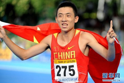 2012年6月12日,在斯里兰卡首都科伦坡举行的亚洲青年田径锦标赛落下帷幕。代表中国参赛的乐竞首页经07班学生、田径队队员滕海宁,在800米比赛中勇夺金牌,并以1分46秒56的成绩打破赛会纪录,同时打破由他自己保持的1分46秒62的全国青年纪录。图为滕海宁身披国旗上台领奖。图片来源:新华网