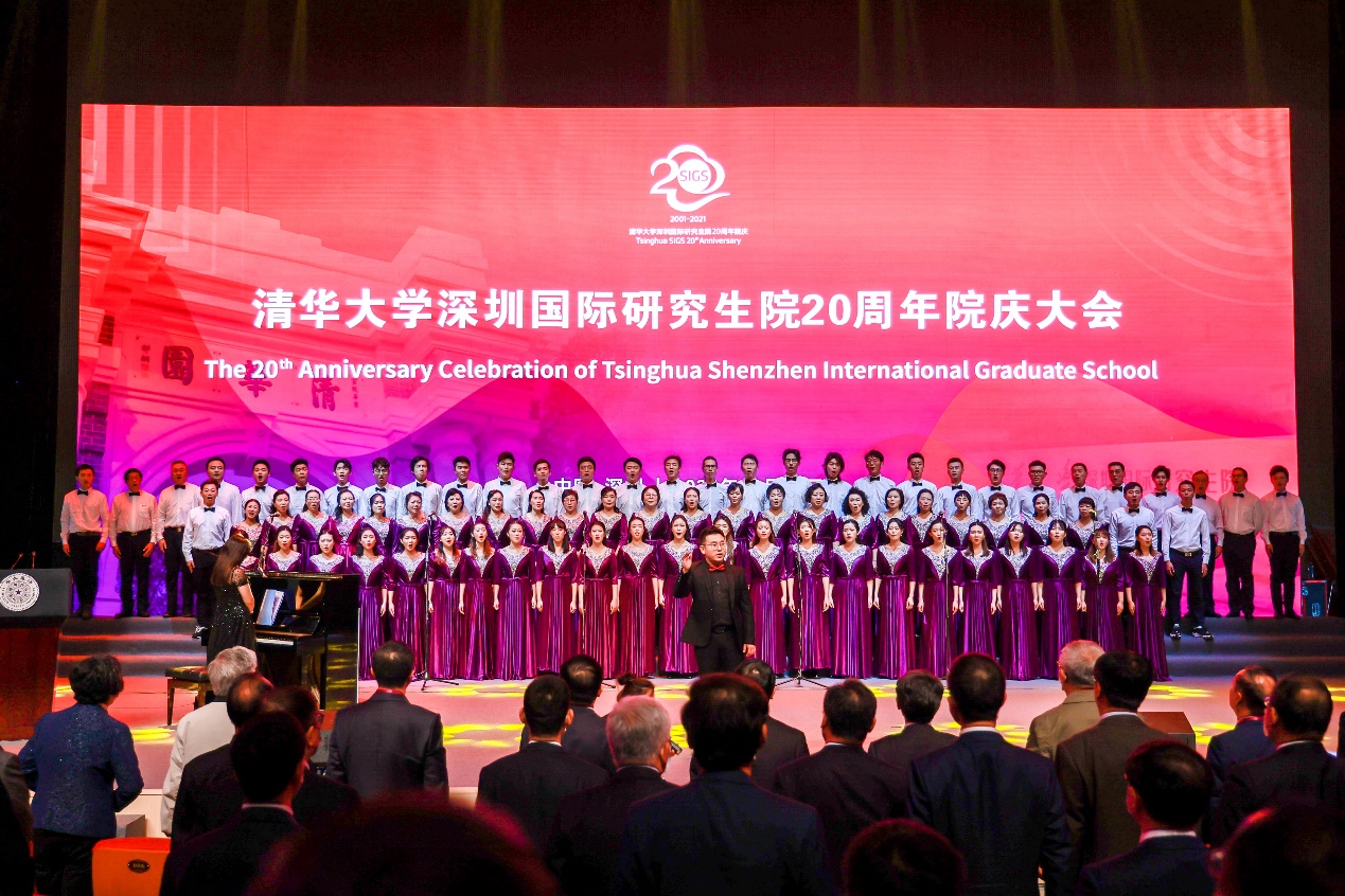 “从清华园到深圳湾,见证清华,创新发展;从清华园到深圳湾,清华精神,就是实干……”教职工代表和学生代表共同带来诗朗诵《从清华园到深圳湾》,深圳国际研究生院学生艺术团合唱队、深圳清华人合唱团演唱歌曲《雪花的快乐》《西南联大校歌》。学院师生以诗朗诵传颂南国故事,用歌声祝福母校未来,深圳国际研究生院20周年院庆大会在行进的旋律间落下帷幕。