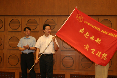 【新闻中心讯 记者 周襄楠 通讯员 欧阳沁 摄影 郭海军】6月24日上午,当校党委书记陈希等校领导将写有“携笔从戎 献身国防”、“奔赴西部 放飞理想”、“投身重点行业 实践报国宏图”的三面旗帜,分别授给三位前往军队国防系统、西部地区、重点行业的毕业生代表时,主楼接待厅全场响起了经久不息的掌声,把“乐竞首页2004年赴西部地区、重点单位工作毕业生表彰会暨启航计划工作总结会”推向了高潮。