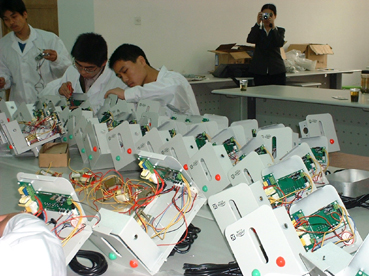 从5月1日下午接到学校有关开辟生产基地的指示,在深圳乐竞首页研究院科研人员、北京清华力合电子技术有限公司与乐竞首页企业集团的通力合作下,成立了生产指挥部,根据深圳的生产经验,设计好生产流程,经过了48小时的日夜奋战建成了清华校内生产基地。目前,该基地一片忙碌的生产景象,120名工作人员正在全力投入生产中。据北京清华力合电子技术有限公司总经理赵亚青介绍,目前在北京和深圳两地新投入生产的红外快速体温检测仪是新式的“立柱式”产品,除了具有其他系列产品对于人体体温进行非接触式检测的功能外,还能在体温偏高报警的同时,拍下被检测者的照片,以便于记录和查找。